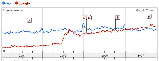 I was playing with Google Trends yesterday. With a few keystrokes you can satisfy your need for both useless trivia interesting facts and the data to back it up. Where else can you discover that basset hounds are more popular in Hungary, that Hillary Clinton is finally more popular than her husband, or that in spring of 2007, google became more popular than sex: