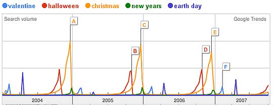 But then i remembered two things. First people are still working on Earth day, so they are at their computers, and second, google skews the results with those cartoon logos they put on their main search page. When you click it, it searches for that term. So bottom line, this just means more people are using google on Earth day than Easter. It makes sense but also reminds us that we have to take these graphs with a grain of salt.
