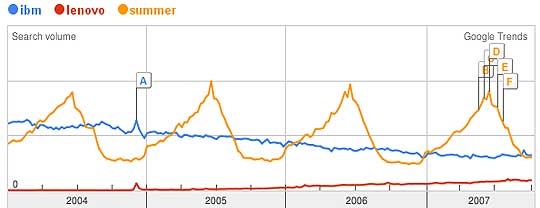 Other things that follow a pattern: American Idol, which is apparently very popular in the Philippines. IBM's star is falling (its as popular now as summer is in the winter) and Lenovo's is rising.