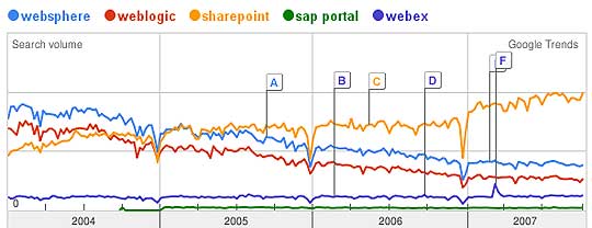 Point A in the graph is where Lenovo bought IBM's PC business. One last graph, this one ties into both IBM and portals. Since I spent a lot of time helping clients get value from their portal investments, lets look at where the market interest lies.