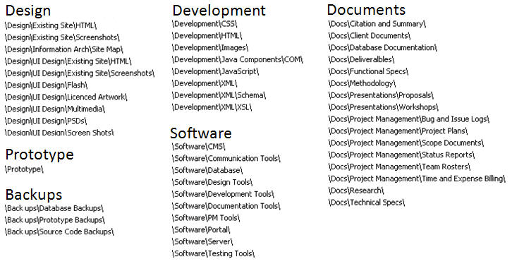 The idea was to start each project with a set of empty folders that map roughly to a pattern that had been established on many projects. I then retro-fitted the structure to old projects. Here it is (you can also
