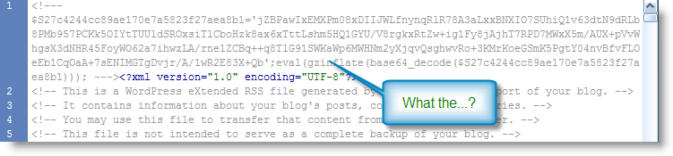 That fist line is a line of code I commented out in the theme. Somehow, wordpress was putting that commented line into the xml feed. So - I went to the theme editor, found the comment, and deleted it - problem solved.