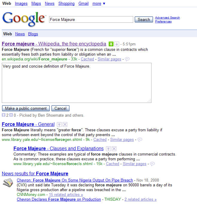 With very little fan fair google made a small change to its search results that may change them forever. I noticed this for the first time today, little arrows that allowed me to promote or demote search results and add a public comment. As this data piles up, google will have a powerful new asset to allow it to rank pages. I wasn't even the first to vote for this item (but I did get the first comment in :)