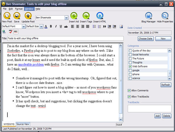 I'm in the market for a desktop blogging tool. For a year now, I have been using Scribefire, a Firefox plug-in to post to my blog from any where on the web. I like the fact that the icon was always there in the bottom of the browser. I could start a post, finish it at my leisure and it used the built in spell check of firefox. But, alas, I have an unsolvable problem with firefox. So I am writing this with Qumana...what do I think, well...(read the rest)